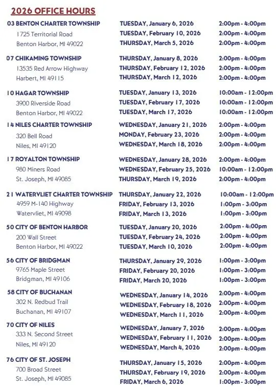 Throughout January, February, and March, Weich will be in Niles Township, St. Joseph, Benton Township, Chikaming Township, Niles, Hagar Township, Bridgman, Royalton Township, Benton Harbor, Watervliet Township, and Buchanan to meet with residents, once each of those months.