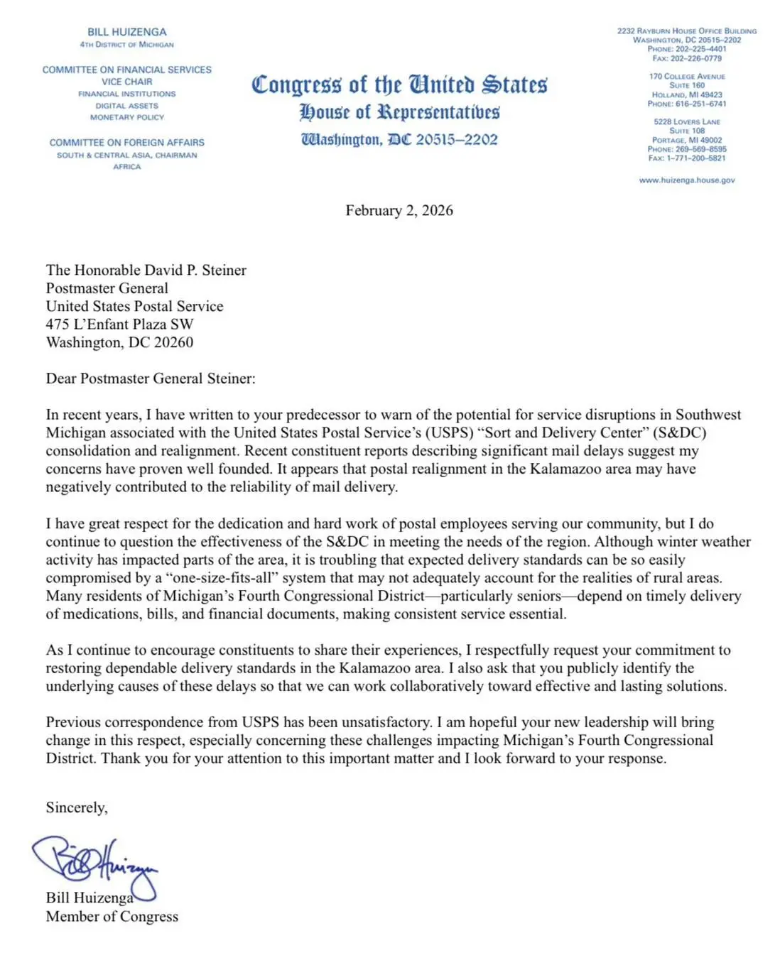 In his letter to Postmaster General David Steiner, he asks for a restoration of dependable service in the area. Huizenga says it seems the Postal Service simply never fully recovered from the COVID era.
