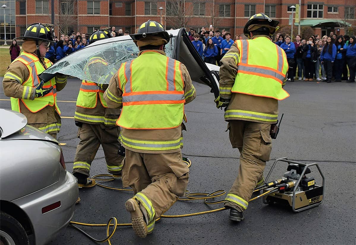 Three hundred and 75 students lined the parking lot perimeter to watch the chopper landing, the arrival of first responders with sirens wailing and Dowagiac firefighters cutting a trapped victim out of his car.